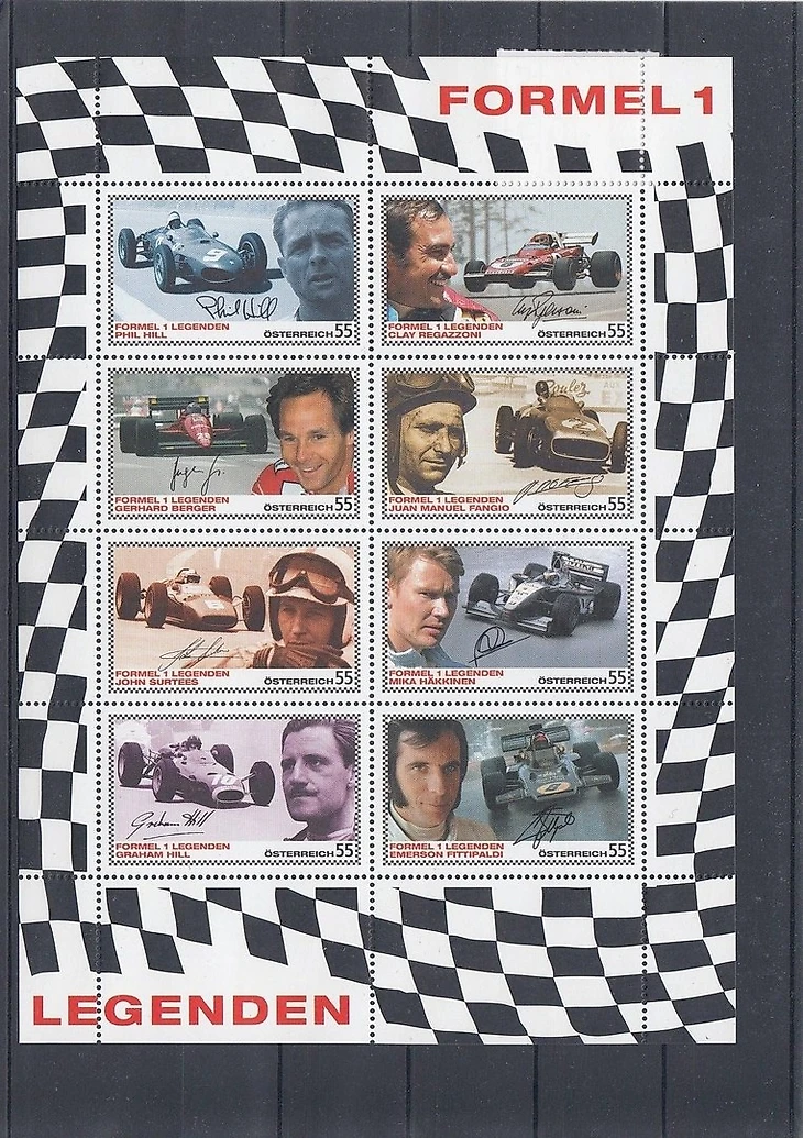 В том же 2007 году почта Австрии выпустила сет с лучшими пилотами «Формулы-1» на свой вкус. В него вошли Фил Хилл (чемпион-1961), Клэй Регаццони (второе место в сезоне-1974), Герхард Бергер (третьи места в сезонах-1988 и 1994), Хуан-Мануэль Фанхио (5 чемпионских титулов), Джон Сертис (чемпион-1964), Мика Хаккинен, Грэм Хилл и Эмерсон Фиттипальди (все трое— дважды чемпионы мира). Очень странный список, не находите?