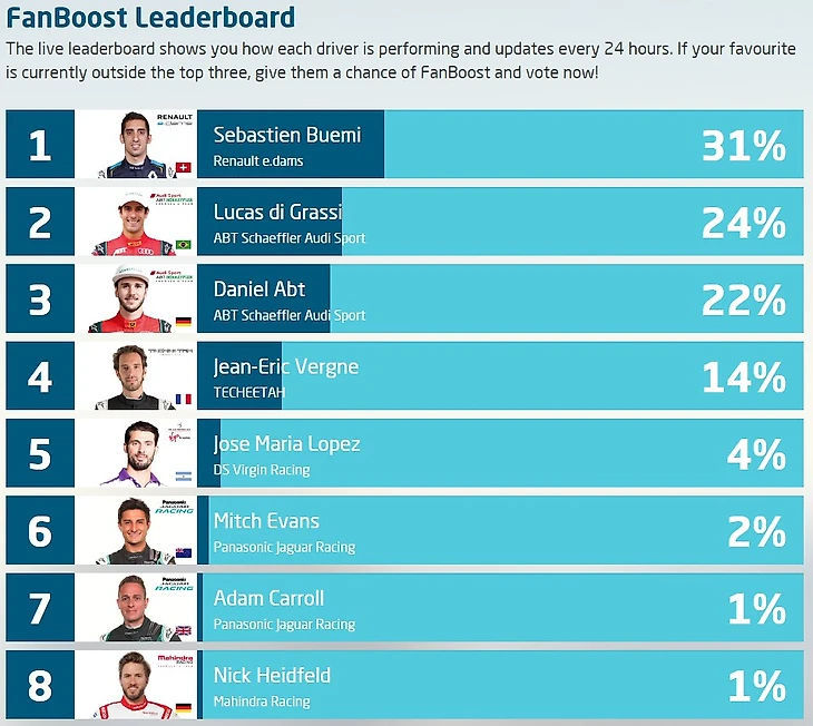 Система равенства в IndyCar или мерило возможностей в Формуле 1. Руководство Формулы Е подумало и отдало все на откуп зрителям. FanBoost получают только три гонщика, выбранные голосованием на официальном сайте. Казалось бы, дополнительные шансы для любимых публикой аутсайдеров. Но не срослось. Проблема, вероятно, была в недостаточной известности многих гонщиков. Молодая серия со всеми вытекающими. Поэтому подавляющее большинство голосов уходило одним и тем же людям от гонки к гонке. Перед сезоном 2016/2017 голоса зрителей распределялись так: