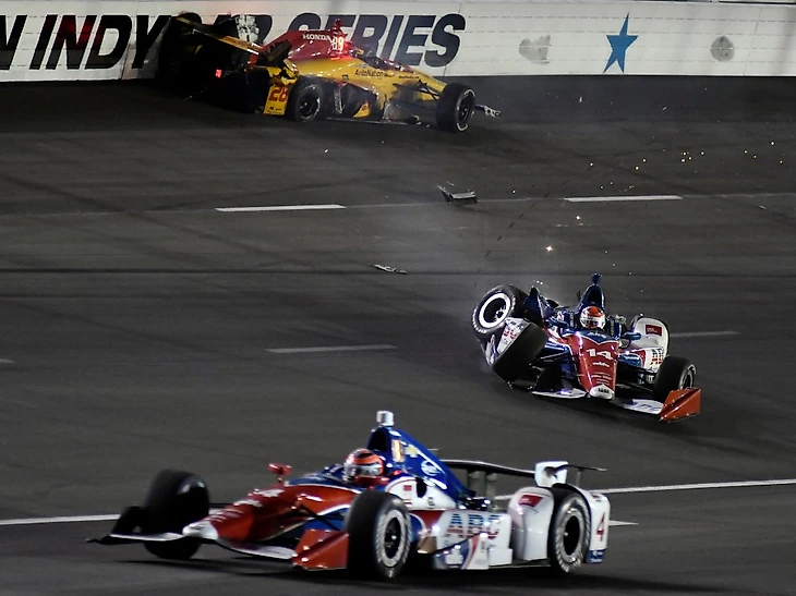 Это «но» случилось на 152 круге гонки. И это «но» звали Тони Канаан. После очередного рестарта машины шли в плотной группе. Джеймс Хинчклифф пошел на обгон Тони в борьбе за 4 место, когда бразилец стал резко менять траекторию перед поворотом. Все бы могло обойтись, но на внешнем радиусе третьим рядом шел Михаил Алешин, и Хинчтауну просто некуда было смещаться. Произошел контакт, похожий на контакт Росси в начале гонки, но если американца вынесло наружу, то Хинч пошел внутрь, устроив самую настоящую цепную реакцию.