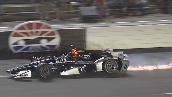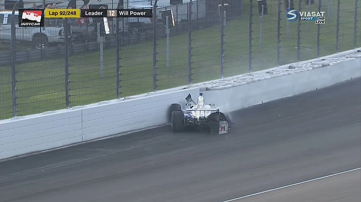 Еще через 50 кругов нас ждал второй коушен. Как по заказу для очередной волны пит-стопов. Лидировали к тому моменту две машины Пенске Уилла Пауэра и Симона Пажно, за ними шел лучший представитель «Хонды» Михаил Алешин. Михаил был хорош весь уикенд и в гонке тоже держал добротный темп, борясь с Элио Кастроневесом за то самое третье место. Именно бразилец и вызвал появление пейс-кара. Изначально причина аварии была не ясна, машина со снопом искр из-под днища проехала по прямой в стену. Спустя некоторое время расследование показало, что виной аварии сал взрыв передней покрышки Firestone. Именно эта ситуация и стала началом конца в сегодняшней гонке.