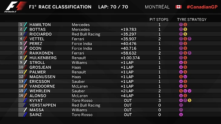 ПК - Феттель, ЛК – Хэмилтон(5), НП - Магнуссен 1. Хэмилтон(10), 2. Феттель, 3. Райкконен, 4. Боттас, 5. Ферстаппен, 6. Риккиардо, 7. Хюлькенберг(5), 8. Масса, 9. Перес, 10. Квят