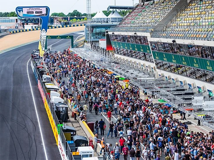 Людей было очень много, и организаторы постепенно вытесняли их с трассы, потому что 15:00 по местному времени — официальное начало гонки. До этого надо забраться на трибуну, пройти три пролета и немного обхитрить проверяющих билеты («По аккредитации нельзя»). Это необходимо, чтобы оказаться наверху, услышать «Марсельезу» и увидеть, как ее поют почти все; а потом переключиться на звук «Что? Где? Когда?», чтобы потом уже наслаждаться немного другим звуком — грохочущего «Корвета» или великанов из LMP1. Несмотря на ограниченность участка, на одном месте можно сидеть несколько часов, ведь уши, глаза и шея сходят с ума и не хотят останавливаться.