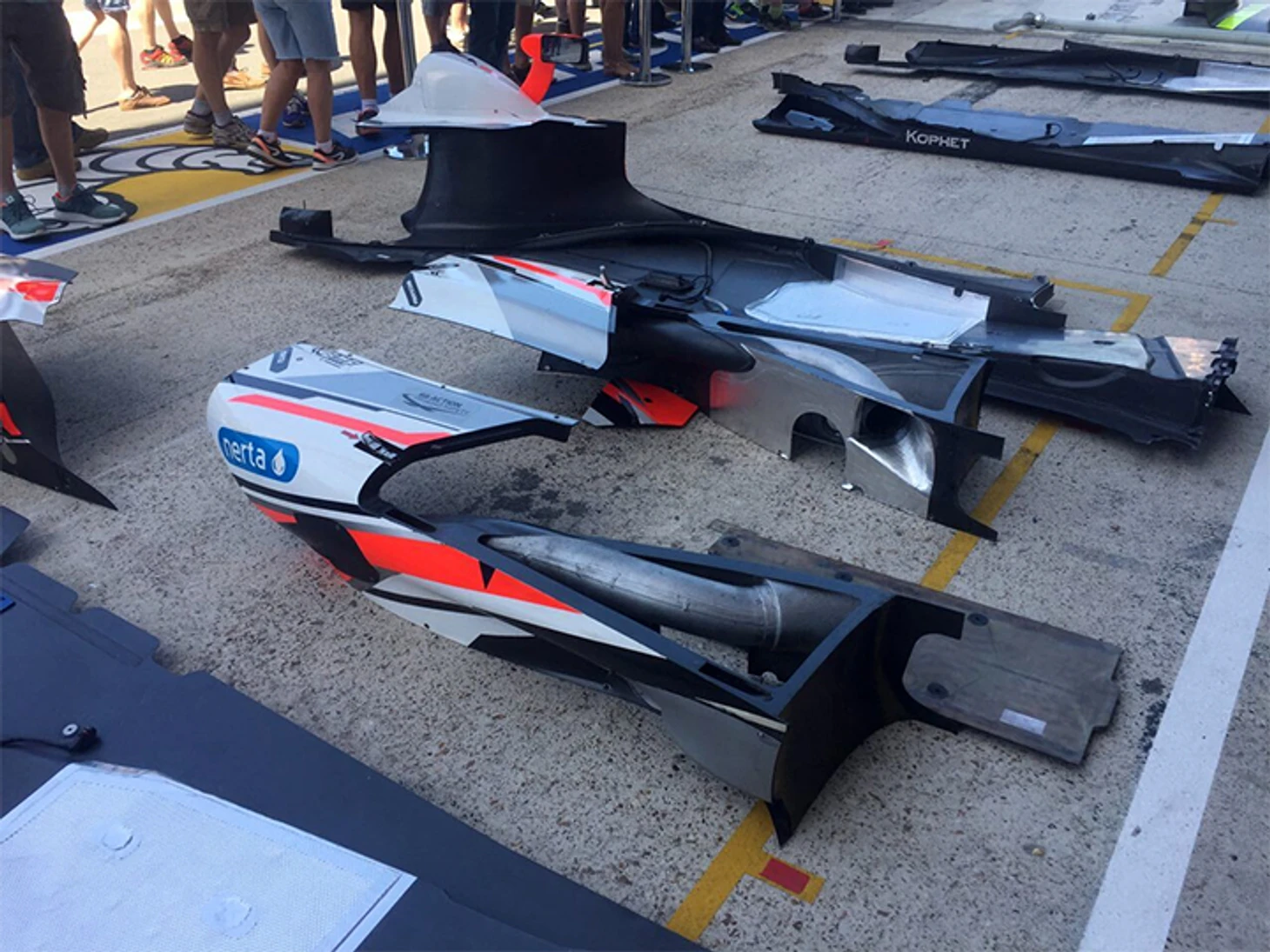Перед входом в боксы стоит деревянное днище. Днище гоночного автомобиля. Делать его из карбона слишком дорого и малоэффективно, потому что нижняя часть всегда стирается, а от дерева избавляться гораздо легче, чем от других материалов. За шинами, цепью инструментов и большими кусками от болида открывается широкая комната. Именно там идет подготовка к победе, а кто-то даже скажет, что в боксах победа вообще создается. Механики ходят с пластиковыми стаканами из-под кофе: они будут готовиться до поздней ночи, ведь машина получится из технологичной сердцевины только в день гонки. Многие составные части лежат на полу или ждут запуска на столах механиков.