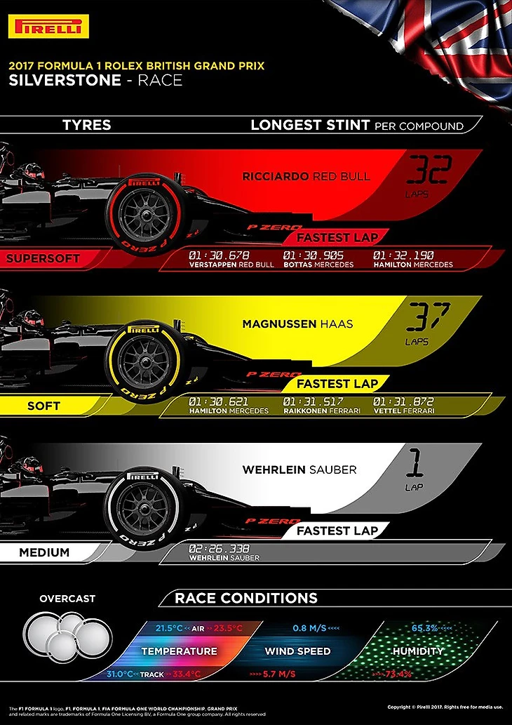 Впервые в истории ГП Великобритании на подиум взошли сразу два финна после того как Кими Райкконен несмотря на прокол на поздней стадии гонки финишировал третьим. Это шестой подиум Айсмена в Сильверстоуне и первый здесь с 2007 года. Оба раза в 2007 и 2017 первый ряд на старте заняли Льюис Хэмилтон и Кими Райкконен. Правда, десять лет назад Кими победил, а Льюис финишировал третьим.