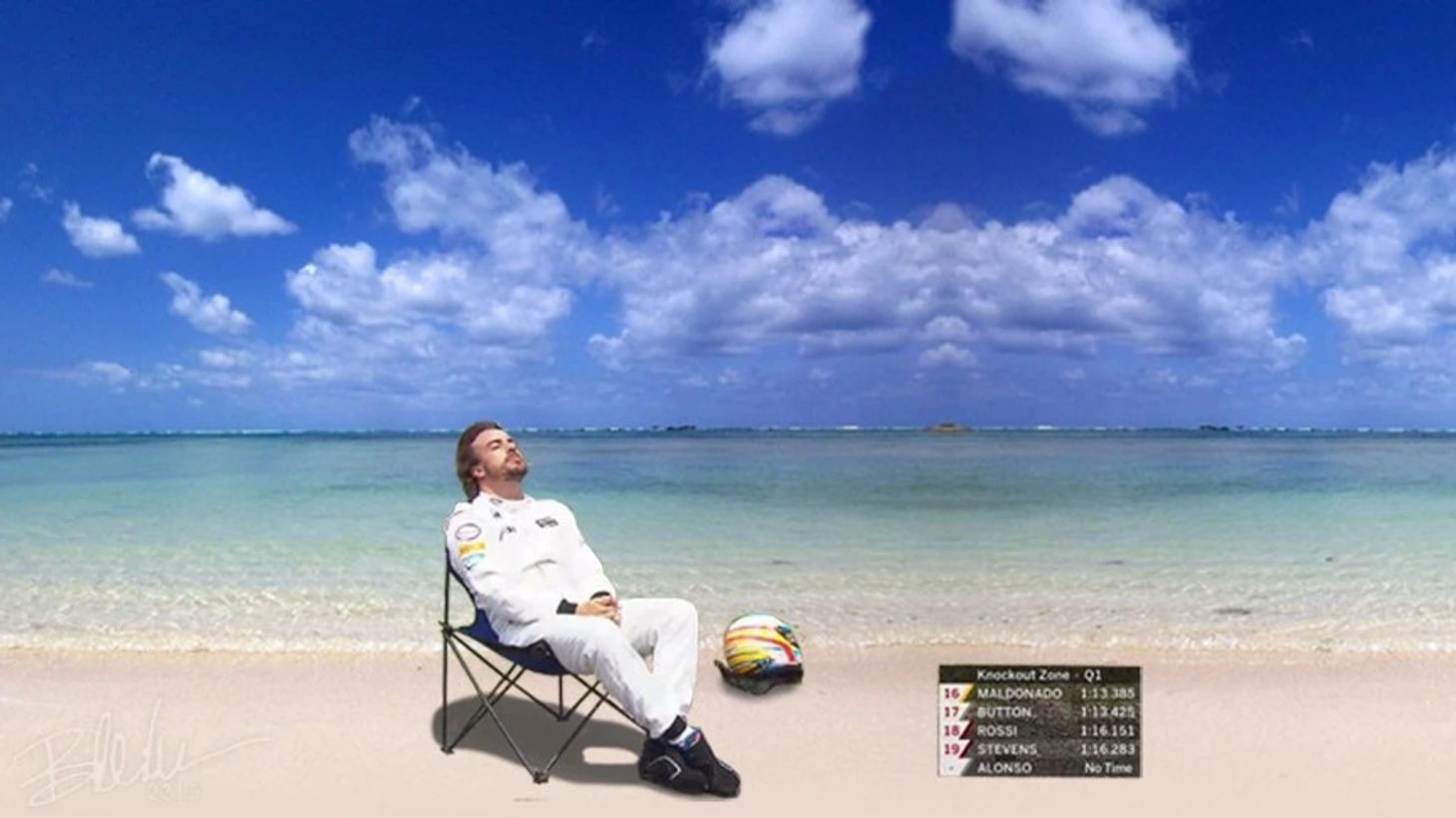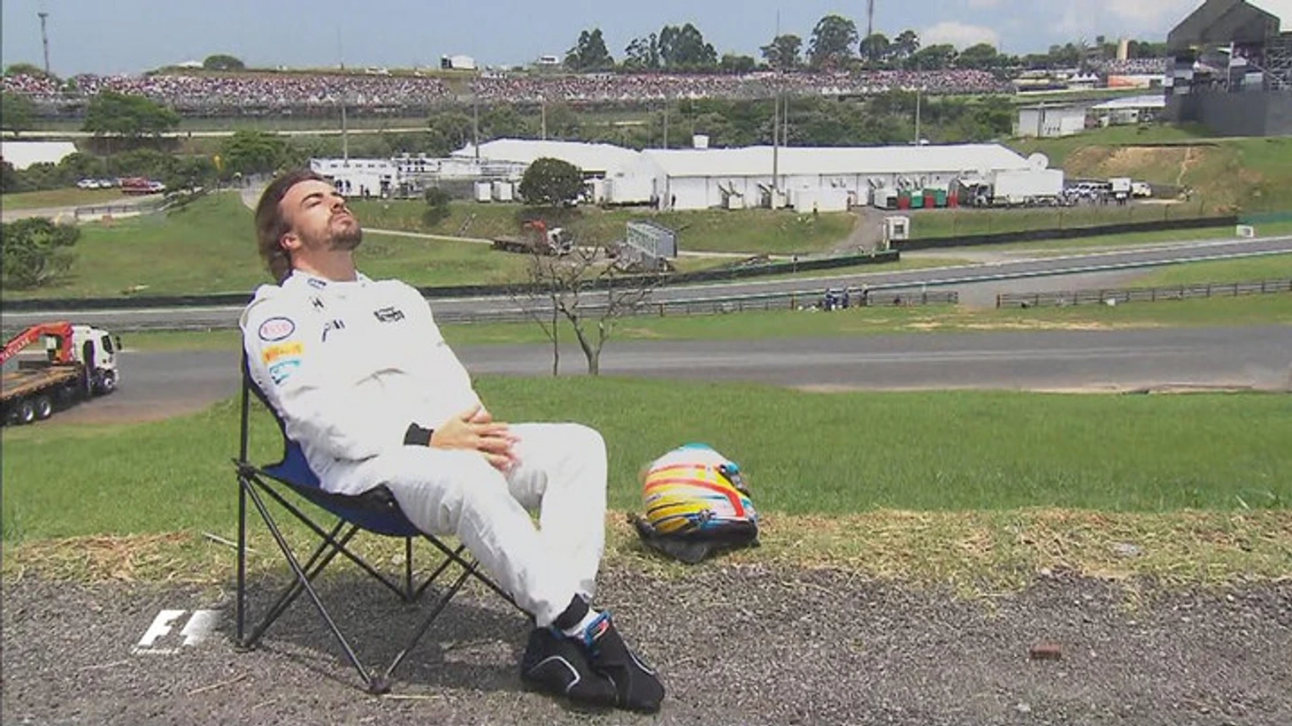 Первоначальная история связана с неудачей испанца двухлетней давности, когда после поломки машины гонщик уселся на складной стульчик и немного позагорал под бразильским солнцем.