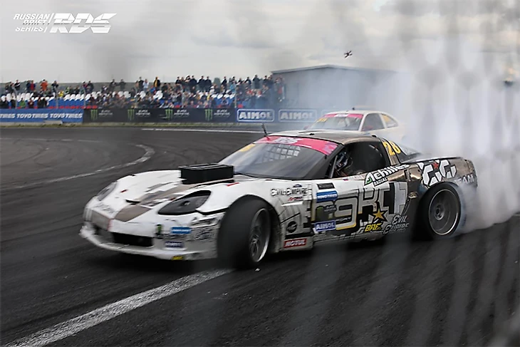 ТОП-8 дали старт Ваня Godzilla и двукратный чемпион РДС Евгений Сатюков. Два Nissan Silvia S14 красиво стартовали в лучах вечернего солнца. Но преимущество под капотом и богатый опыт обеспечили Евгению место в полуфинале. Яркие проезды дверь в дверь Евгения Ружейникова и Дениса Репкина порадовали зрителей и судей четкой траекторией и перекладками. 560-сильный Nissan Silvia S14 Евгения оставил за бортом более мощную Toyota Supra Репкина.