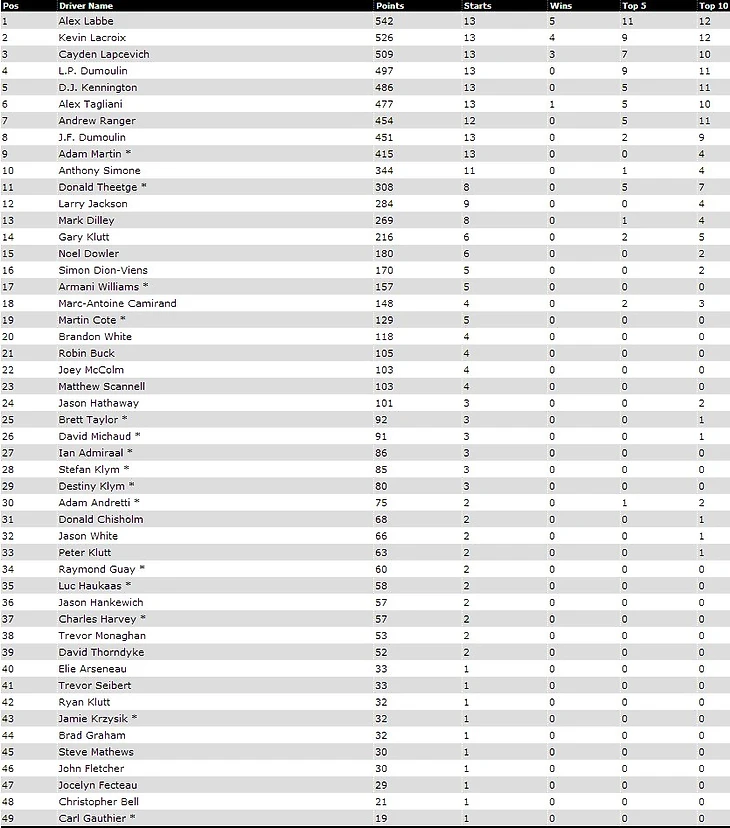 Что же касается предыдущего чемпиона, Лапцевич был неплох на протяжении всего чемпионата. Но, всего три победы и три финиша за пределами топ-10 явно не помогли молодому канадцу повторить успех прошлого сезона. Впрочем, отстал он от чемпиона на 33 очка, и если бы канадский дивизион проходил не в тринадцать, а в двадцать этапов, то победитель вполне мог быть другим. Да и надо отметить, что для Лапцевича сейчас наступает сложный этап, так как на протяжении всего сезона его вели в "НАСКАР Некст", а целью этой школы является подготовка кадров для национальных дивизионов. Конечно, Кэйден может остаться в Канаде и ставить рекорды, благо, что возраст позволяет, но чувствуется, что его намерения простираются на юг, в сторону США. Учитывая, что его ровесники, точнее, его поколение, гонщики-тинейджеры уже активно осваивают пикапы (Хйэли, Грэгсон, Гиллилэнд), Лапцевич видится этаким второгодником с призом лучшего парня на деревне. Но в любом случае, это значительно лучше чем, ничего. Лучше, чем шестое место в чемпионате, как у Алекса Тальяни, которого победы обходят стороной еще со времен открытых колес.