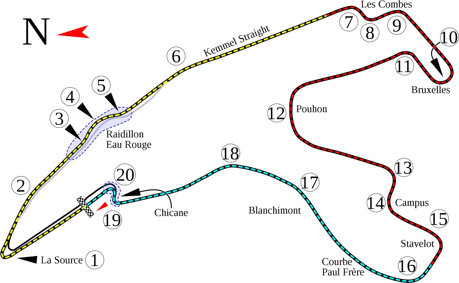 В данной конфигурации трасса начинается шпилькой La Source, в ней на старте гонок разных серий часто бывают массовые аварии или столкновения. Далее следует небольшая прямая до очень красивой и быстрой связки поворотов Eau Rouge. Левый по мосту через одноимённую речку, правый на подъёме и левый наверху, выводящий на прямую Kemmel. Этот поворот многие гонщики считают своим любимым. Он воспринимается как испытание для самого себя, сможет ли пилот пройти его на максимальной скорости и выиграть время или сбавит скорость, потеряя его. После прямой начинается второй сектор со среднескоростными поворотами, которые требуют большей прижимной силы от прототипа для более эффективного прохождения. Третий сектор по скорости можно сопоставить с первым, быстрый Blaunchimont и 320-330 км/ч перед шиканой «Автобусная остановка», выводящей на прямую старт-финиш. В результате настройка требует компромисса между скоростью на прямых первого и третьего сектора и прижимной силой во втором, поэтому углы атаки антикрыльев уменьшаются, а нагрузка на двигатель возрастает. На данном автодроме проходят Гран-при Бельгии Ф1, "24 часа Спа" и гонка "6 часов Спа", входящая в зачёт Чемпионата Мира по гонкам на выносливость с 2012 года. Она используется как финальная репетиция для известной гонки 24 часа Ле-Мане на кольце Сартэ. ELMS, возобновлённая в том же году, приедет в бельгийский Спа лишь во второй раз, до этого здесь проходили только 6-часовые гонки. Год назад победу в одной из самых драматичных гонок сезона одержал экипаж DragonSpeed на прототипе Oreca 05.