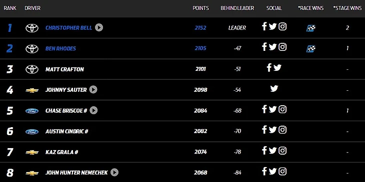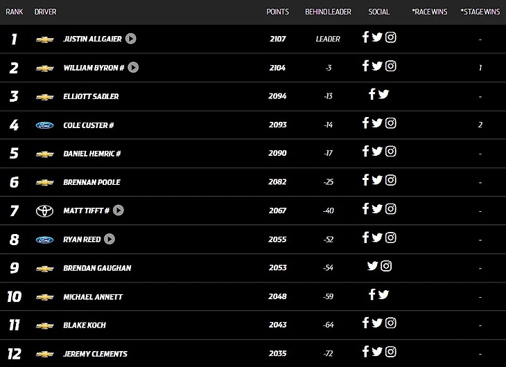 В зоне вылета находятся Кэз Грэла и Джон Хантер Немечек, которым не помог финиш в топ-10.Чтобы продолжить борьбу хотя бы одному из них, надо ожидать схода Остина Синдрика и самим занимать место повыше, либо победить, чтобы обеспечить себе путевку в следующий раунд. Последняя гонка первого раунда пройдет 14 октября на суперспидвее в Талладеге.