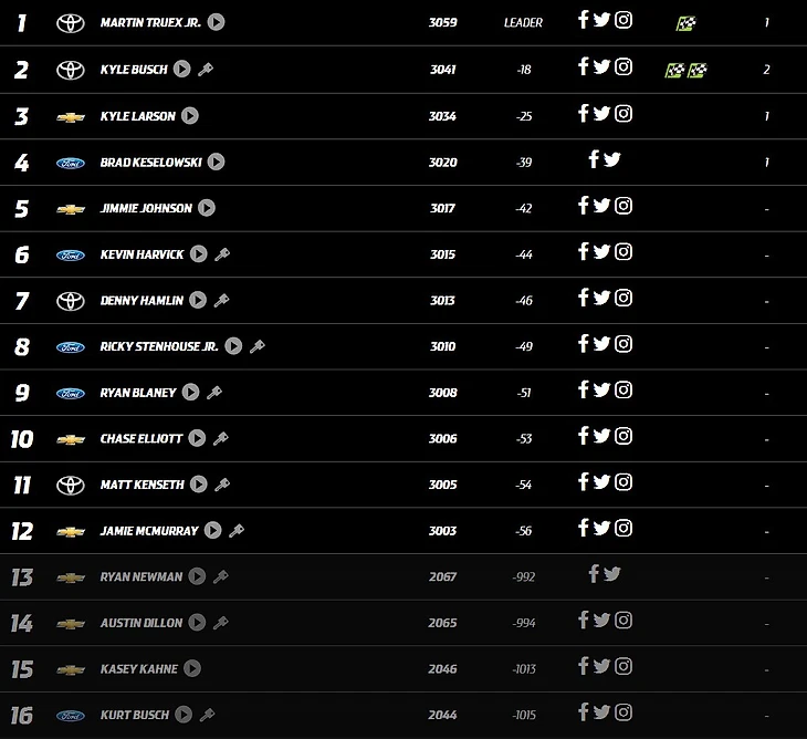 В неудачниках первого раунда остался Райан Ньюман, ставший для всех поклонников Чейза Эллиотта врагом номер один. Райан, честно сказать, весь сезон после победы в Финиксе весной, лишь пару раз показав, что когда-то он был не случайным контендером. "Ковбой" Диллон также остановился в первом раунде. Год назад он тоже вылетел в первом раунде и тоже замер на 14 месте. Но тогда Диллон сделал это без побед. Правда, он чаще заезжал в топ-10, периодически напоминая о себе. Теперь же машина #3 опять остановилась в первом раунде, но дед Диллона должен быть доволен. "Третий номер" давно не побеждал, но смог это сделать в Шарлотте. Ну а плей-офф? Удачное дополнение, на которое никто не рассчитывал. Как не рассчитывал и Курт Буш, который практически не верил в успех уже после второй гонки первого раунда. Двадцатое место в Довере лишь подтвердило то, что на машину под номером 41, в плей-офф, свалились все несчастья. Был еще Кейси Кейн. И да, участников из "Хендрик Моторспортс" теперь двое - Джимми и Чейз, но скажите честно, кроме самого Кейна, кто-то рассчитывал, что он пройдет во второй раунд?