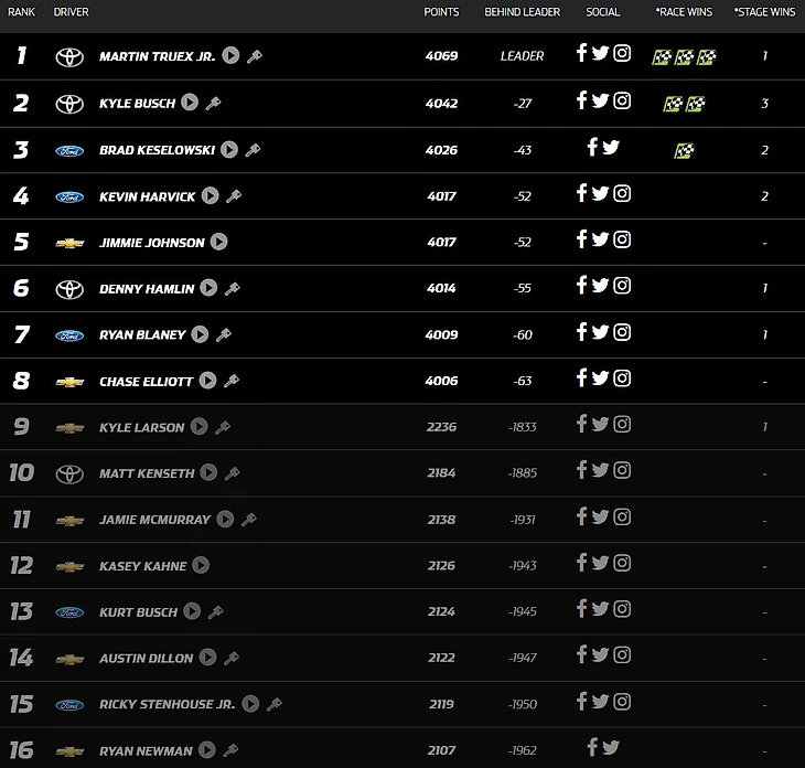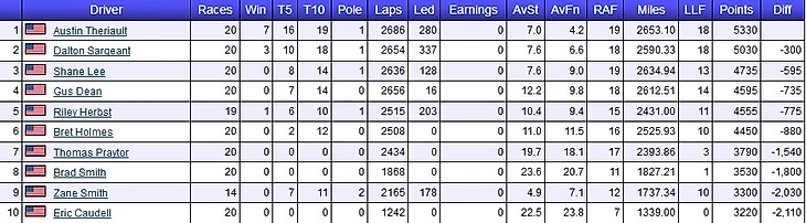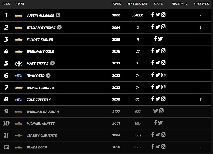 Для "регулярных" гонщиков начался полуфинал плей-офф и каждый старался набрать побольше очков, чтобы обеспечить себе запас прочности перед следующими этапами. Довольно неожиданно впереди оказался Джастин Оллгайер, финшировавший позади Уильяма Байрона. Впрочем, секрет двухочкового преимущества Джастина надо коллегой по "Джей-Эр Моторспортс" раскрывается в том, что Оллгайер финишировал выше Байрона по итогам сегментов. на счету Оллгайера и Байрона 3066 и 3064 очков соответственно, поэтому еще один финиш обоих спортсменов в топ-10 автоматически выведет их финал. Особенно, если победу отпразднует "бушвакер" или кто вне плей-офф.