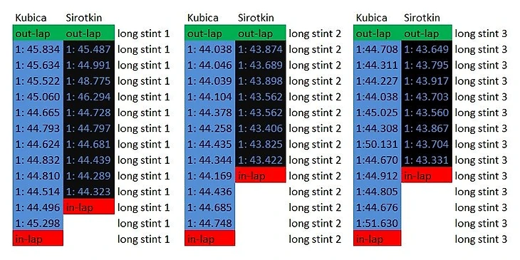 Роберт и Сергей два дня работали по одинаковым программам, провели за рулем болида примерно одинаковое время и не допускали ошибок. Кубица впечатлил стабильным прохождением кругов и ни разу не дал усомниться в своих физических возможностях, а Сироткин неожиданно оказался намного быстрее. Почти в каждой серии он привозил сопернику до секунды на круге и при схожей стабильности. Это гигантская разница.