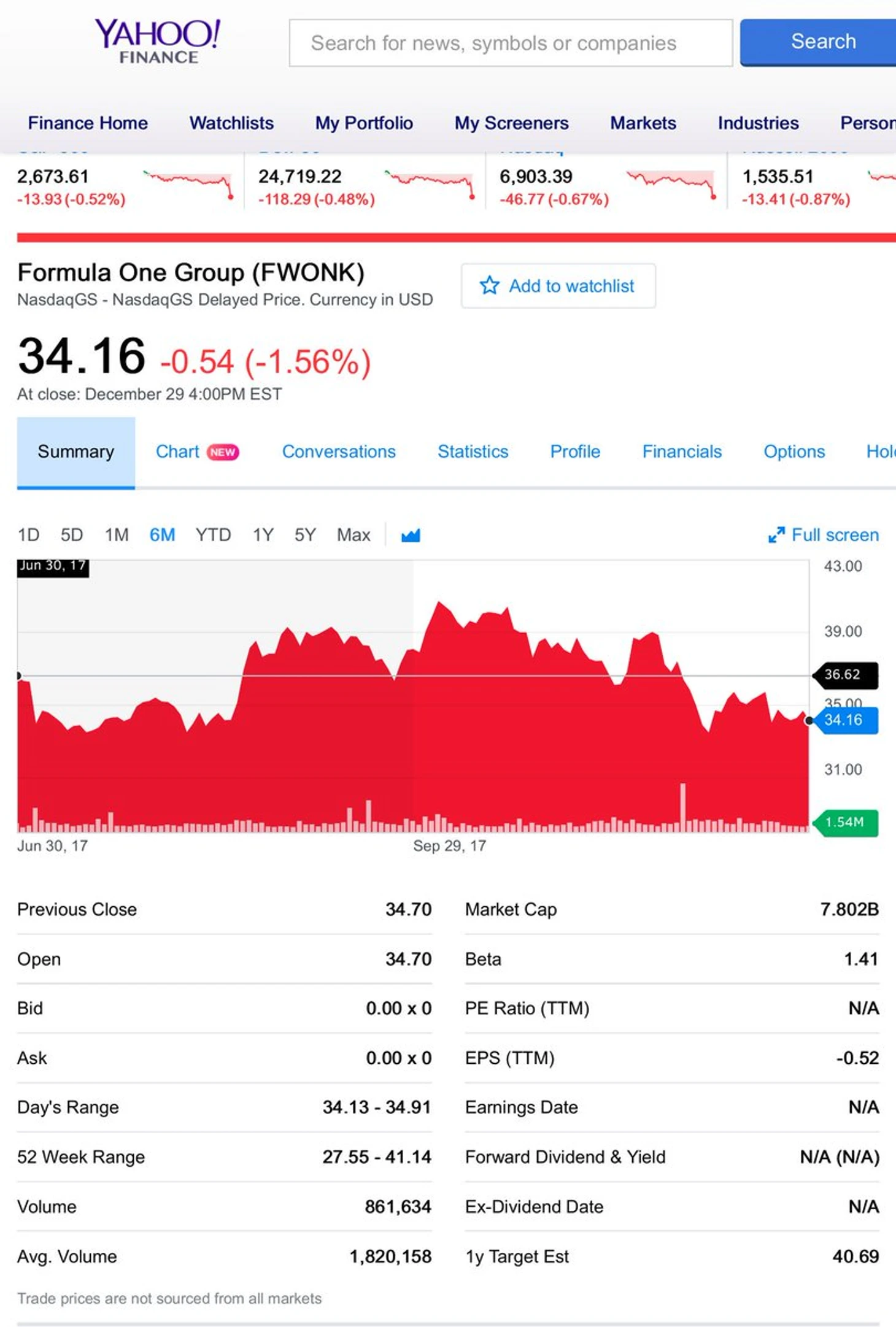 Таким образом, если бы вы купили акций серии на 500 фунтов стерлингов в начале лета, сейчас ваши бумаги стоили бы уже 465,5 фунтов. Судя по всему, падение спровоцировали неясности по поводу регламента 2021 года, угрозы «Феррари» уйти из «Ф-1», а также неудачный дизайн, представленный на последнем Гран-при сезона в Абу-Даби. В то же время регуляторы нашли несколько нестыковок в отчетах, предоставленных владельцами: так, Liberty Media заявили о росте посещаемости на Гран-при Азербайджана на 138,17%, в то время как власти Баку объявили о росте продаж билетов всего в 30% по сравнению с первой гонкой в 2016 году.