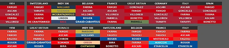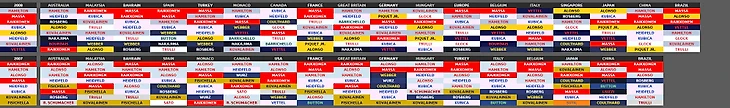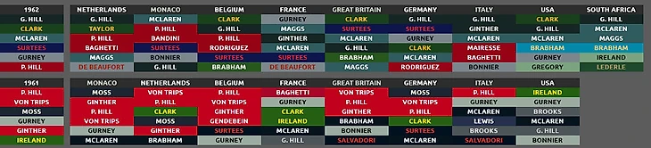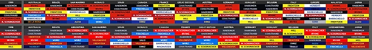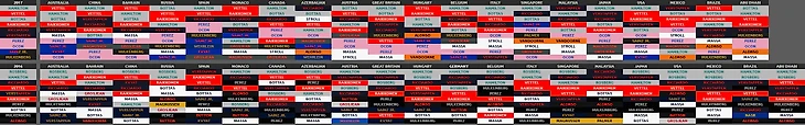 Сделал инфографику для себя с результатами всех Гран-При с 1950 года по 2017 (указаны только гонщики, набравшие очки).