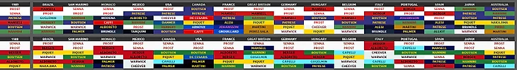 Инфографика результатов Гран-При Формулы-1 с 1950 по 2017 год