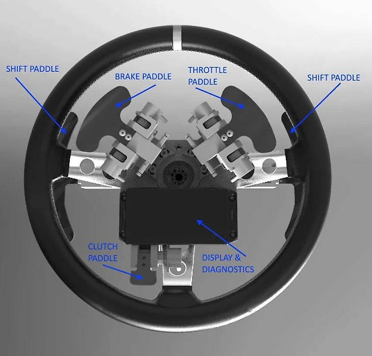 Для удобства пилота на кнопки под рулем, которыми обычно переключают передачи, полностью перенесены функции тормоза и газа (Brake paddle и Throttle Paddle на картинке). Трансмиссия же управляется с новых лепестков по бокам руля (Shift paddle на картинке), а сцепление перенесено вниз конструкции.