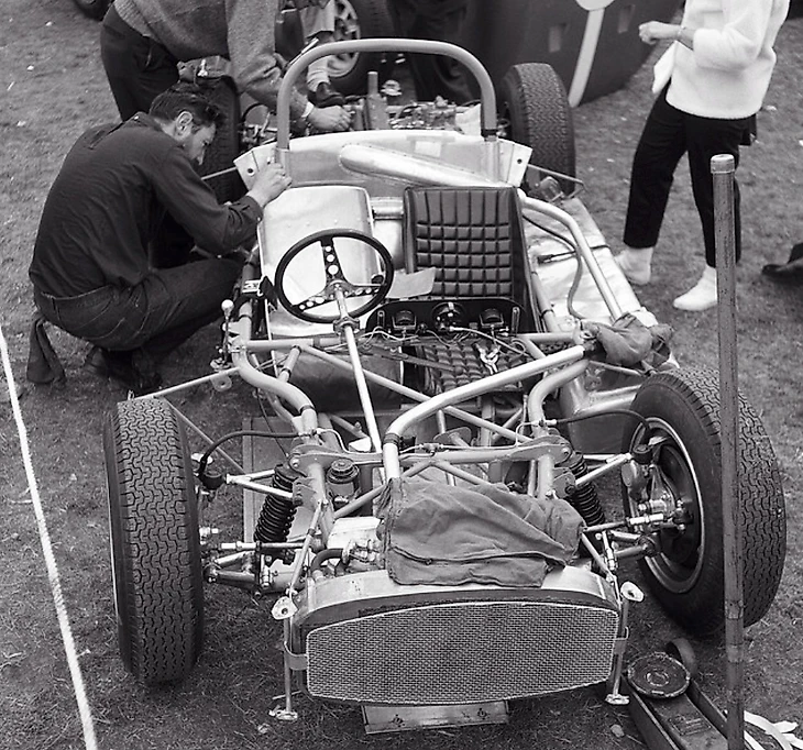 Cooper-Oldsmobile в паддоке, 1964 (видно второе сидение, установленное вследствие ужесточённого в 1963 году регламента)