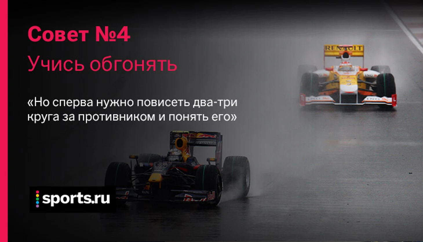 «Конечно, все зависит от личности обгоняемого пилота и траектории, которую он выбирает в поворотах. Всегда лучшая стратегия — повисеть два-три круга за противником, понять его и его и стиль прохождения поворотов. Тогда уже можно рисковать. Лучше выбирать внешнюю траекторию — тогда у тебя будет больше возможностей для позднего торможения и больше пространства на треке. Но всегда нужно помнить об уровне собственного сцепления и состоянии трека, чтобы не попасть на «червячки» от шин или обломки.