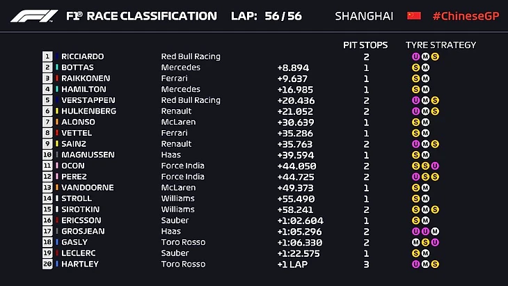 Теперь о тех самых конкурентах. Все ожидали, что гонка станет третьим раундом разборок Себатьяна Феттеля и Валттери Боттаса, и до самого выезда машины безопасности все к этому и шло. На 27 круге Валттери смог пройти Райкконена и возглавить пелотон. Казалось бы, исход гонки решился именно тогда, но пилоты «Toro Rosso» думали иначе. Пьер Гасли и Брендон Хартли не смогли разобраться между собой, как итог – контакт, обломки на трассе и выезд машины безопасности. Воспользовавшись запретом на обгон под желтыми флагами, несколько пилотов сменили шины на более быстрые комплекты, но реальную выгоду из этого смог извлечь только Риккардо, обойдя последовательно Хэмильтона, Феттеля и Боттаса.