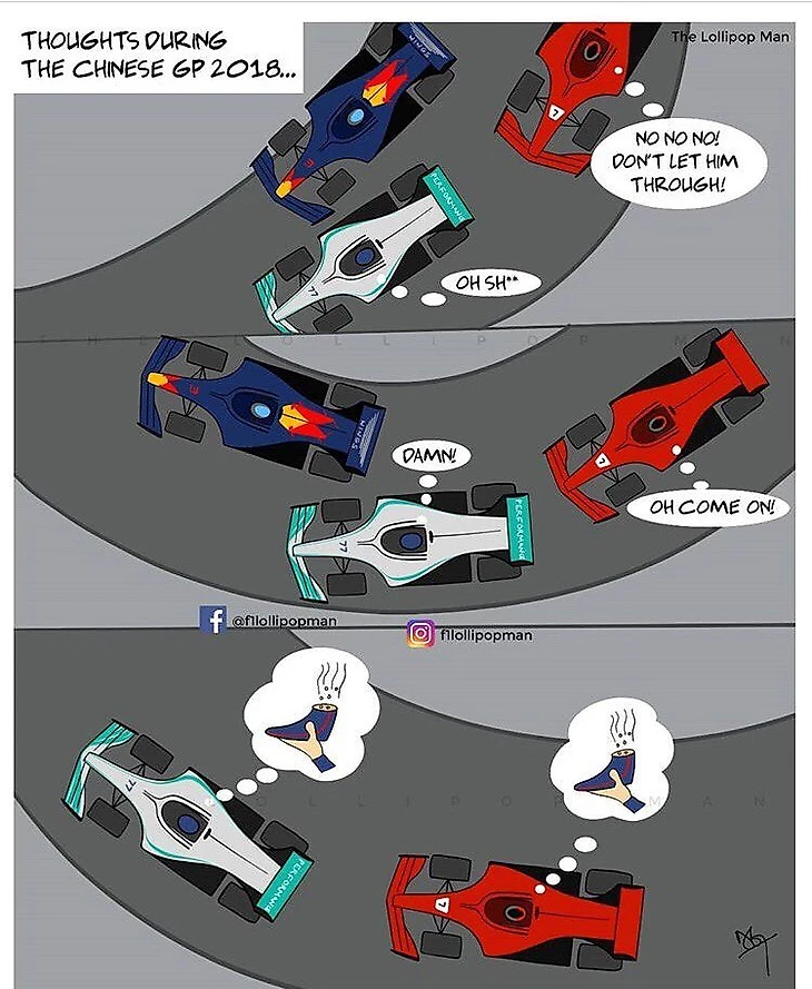 Автор различных комиксов о «Формуле-1» f1lollipopman выпустил очередной рисунок, в котором раскрыл мысли пилотов, обгоняемых гонщиком «Ред Булл» Даниэлем Риккардо.