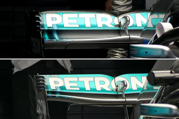 «Мерседес» в свою очередь убрал лишнюю верхнюю пластину с заднего антикрыла.