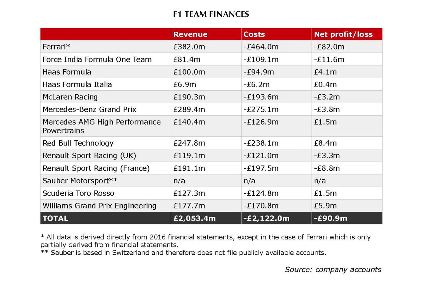 Авторитетное издание «Форбс» собрало инсайды из консалтингового агентства Formula Money и газеты Independent и опубликовало чарт бюджетов команд на 2017 год по финансовым показателям 2016-го (и по движению средств на счетах команд).