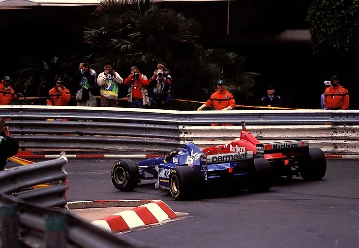 На трассе организовалось четыре группы: Хилл-Бенеттоны-Ирвайн и Ко-Бадоер. Эдди действительно был не "качественным", но локомотивом почти для десятка пилотов. Вышеуказанные группы разрушились, когда Бергер начал терять время относительно напарника, а потом заехал в боксы и не смог тронуться - коробка. Дорога у Средиземного моря начала немножко подсыхать, и темп несколько вырос. Теперь был вопрос в том, когда менять резину можно будет на слики?