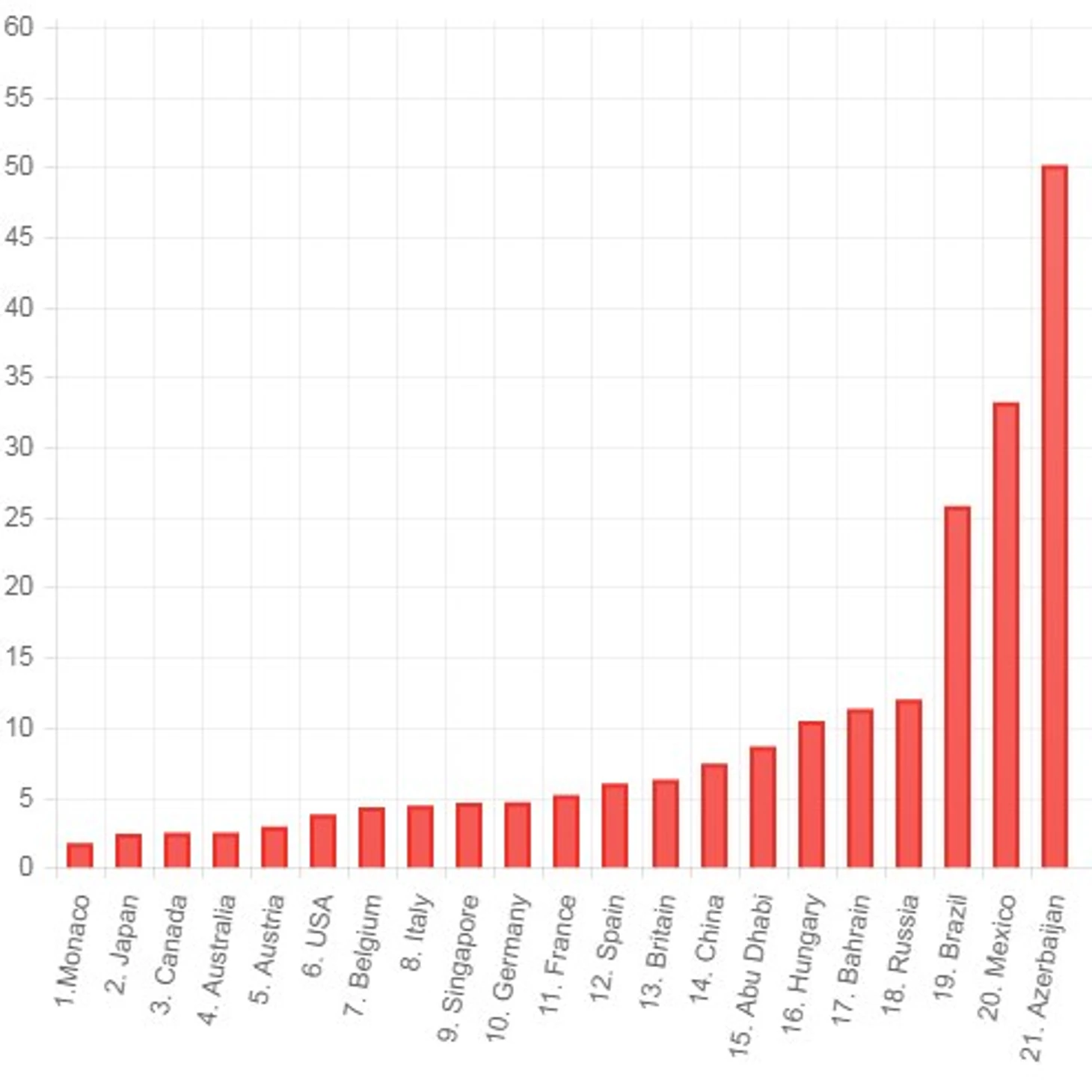 Несмотря на стоимость билетов, незаметнее всего поход на Гран-при обходится монегаскам, японцам, канадцам, австралийцам, австрийцам, американцам, бельгийцам, итальянцам, сингапуржцам и немцам — им самый бюджетный вариант обойдется в менее пяти процентов месячного дохода. Самой недоступной гонка оказалась для жителей Азербайджана (более половины месячного дохода), Мексики (треть месячного дохода), Бразилии (четверть месячного дохода) и России (12 процентов месячного дохода).