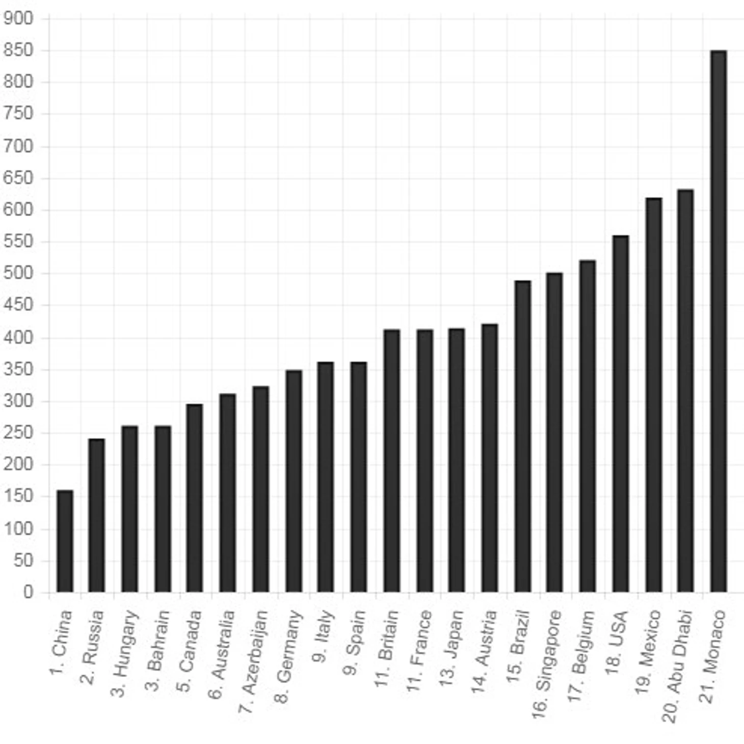 Их расчеты касались только права посещения трека и места на трибуне — стоимость размещения в отелях на рейтинг никак не повлияла. Все цены указаны в долларах без включения комиссий или стоимости доставки. Также некоторые треки предлагают скидочные программы и предварительную продажу по сниженной стоимости — их по понятным причинам тоже не учитывали в исследованиях.