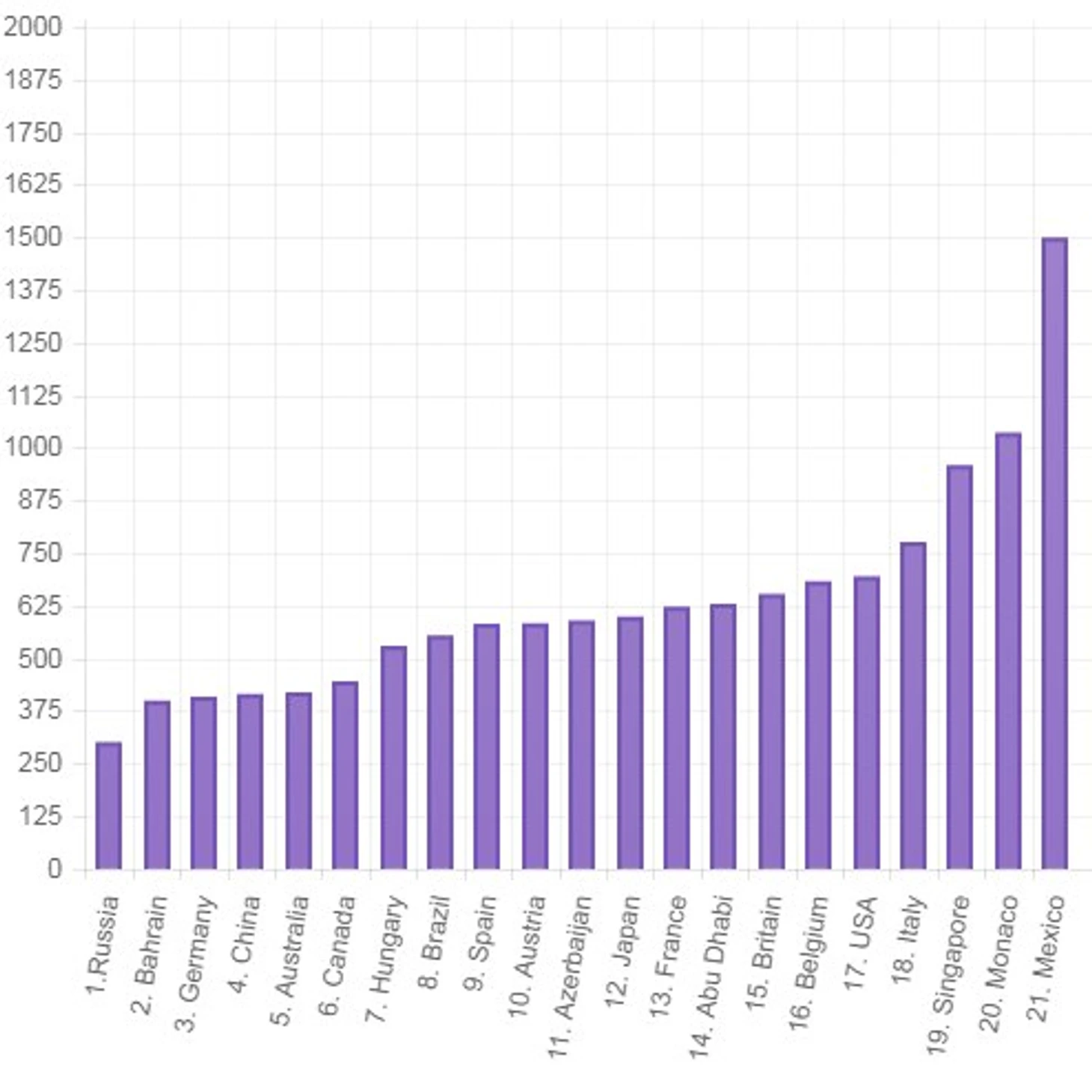 Место на трибуне у пит-лейн на весь гоночный уик-энд обойдется на «Сочи-Автодроме» в 301 доллар. Самая высокая цена зарегистрирована в Мексике — 1500 долларов.