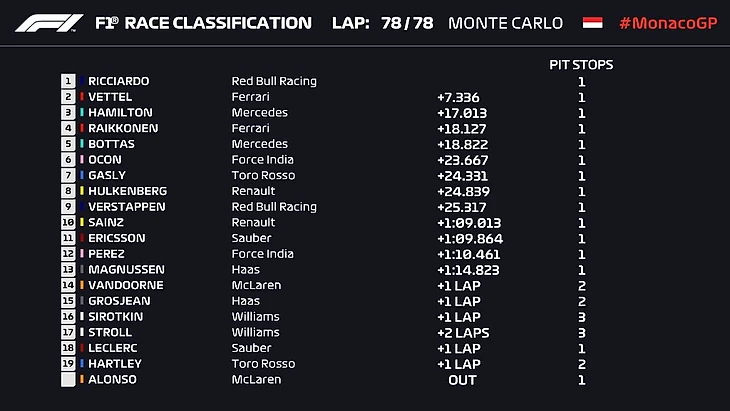 Поул - Феттель, ЛК - Риккардо, НП - Сайнс; 1. Феттель(18), 2.Риккардо(18), 3. Хэмилтон(25), 4. Райкконен(25), 5. Ферстаппен(10), 6.Боттас(18), 7. Алонсо, 8. Хюлькенберг(25), 9. Сайнс(18), 10. Перес(15)