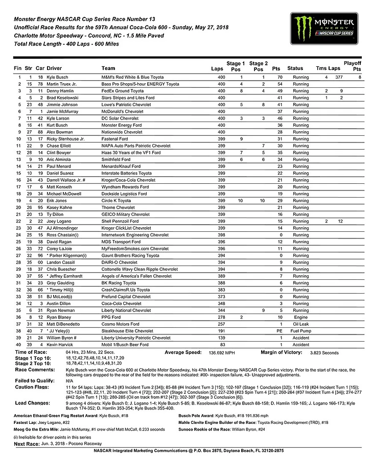С самого начала и до конца, Кайл Буш доминировал на трэке. "Coca-Cola 600" - единственная гонка, которую не выигрвал Роуди. Сегодня он стал лучшим, причем не только в самом заезде, а возможно еще и одним из лучших в истории.