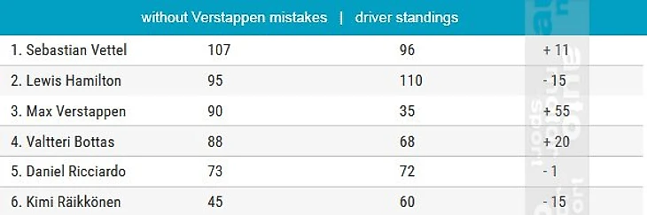 Так Себастьян Феттель из «Феррари» набрал бы на 11 очков больше и лидировал бы в чемпионате, Льюис Хэмилтон из «Мерседеса» потерял бы 15 очков и стал бы вторым, сам голландец стал бы внезапно третьим с проигрышем англичанину всего в 5 баллов, Валттери Боттас тоже оказался бы чемпионской гонке, а напарник Макса Даниэль Риккардо набрал бы всего на один балл меньше, но уже не считался бы одним из претендентов на титул.