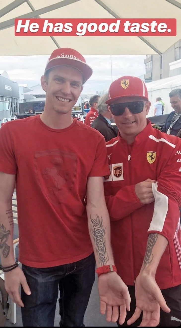 Финский гонщик «Феррари» Кими Райкконен выложил в сториз в инстаграме фотографию с фанатом, сделанную перед Гран-при Канады. Там Айсмен с фанатом позируют с одинаковыми татуировками на руках.