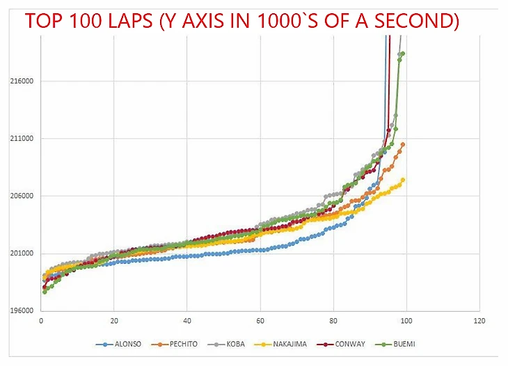 Пользователи reddit в попытках выявить лучшего пилота заводской команды «Тойоты», безраздельно властвовавшей на «24 часах Ле-Мана» 2018 года, собрали на одном графике времена 100 лучших кругов Фернандо Алонсо, Хосе-Марии Лопеса (Pechito на картинке), Камуи Кобаяси (Кова), Кадзуки Накадзимы, Майка Конвея и Себстьяна Буэми.