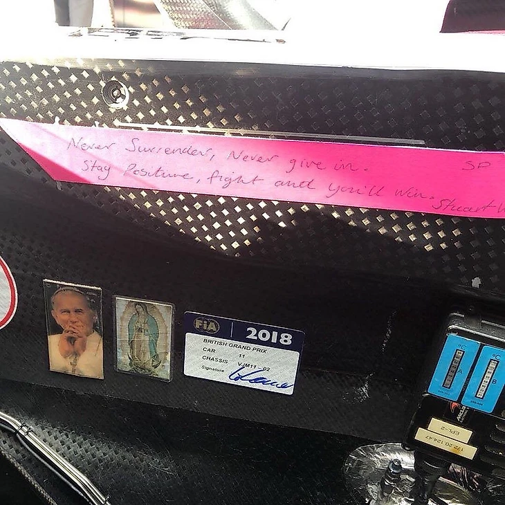 Пользователями reddit было опубликовано крупное изображение «внутренностей» кокпита болида «Форс-Индии» Серхио Переса. Как выяснилось, мексиканский пилот наподобие русских водителей разместил на боковой панели аналог иконок — изображение святого Папы римского Ионна Павла Второго и святой Девы Марии Гваделупской, покровительницы Мексики.