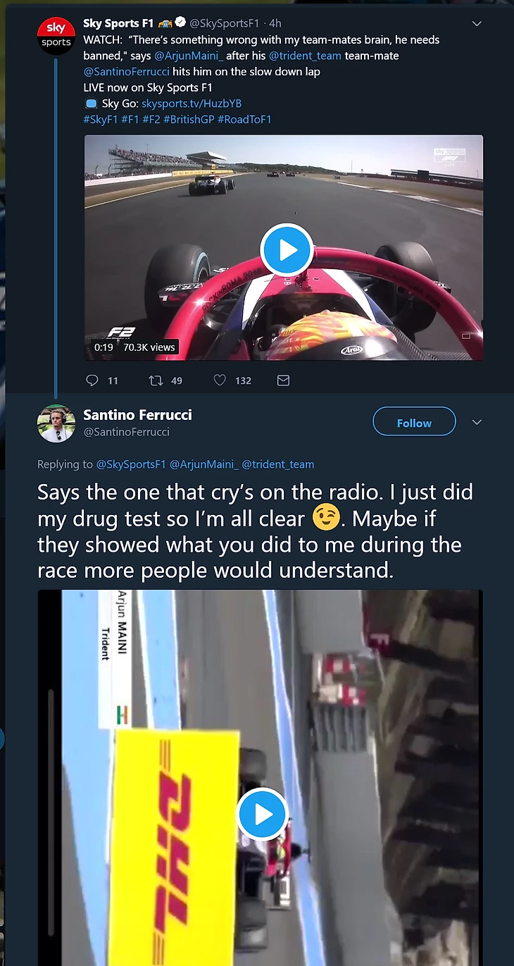 Не прошло и двух недель с последнего внезапного искреннего матерного душеизлияния пилота «Трайдент» Арджуна Маини в адрес команды, как индус снова отжег по радио. На сей раз он оказался недоволен действиями напарника Сантино Ферруччи, с которым столкнулся на круге почета после завершения второй гонки «Формулы-2» по «Сильверстоуну» – причем контакт с американцем у племянника одного из основателей «Махиндры» случился и во время боевого заезда.