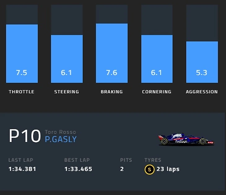 В соответствии с ними, Сергея Сироткина оценили в 7,7 по данному показателю — тем самым он стал вторым. Лучше него оказался лишь победитель гонки Себастьян Феттель из «Феррари» с оценкой в 8,5. Третьим же стал Пьер Гасли из «Торо Россо» со значением в 7,5.