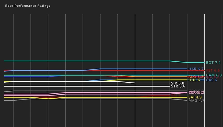 Его оценка в 7,1 сложилась из 8,4 за работу с педалью газа, 3,2 за работу рулем, 9,0 за работу на торможениях, 5,0 за прохождение поворотов и 10 (максимальный балл) за «агрессивность». Валттери закончил заезд пятым — и, кстати, столкновения последних кругов повлияли на его оценки, стоив Боттасу около 0,2-0,3 итогового результата.