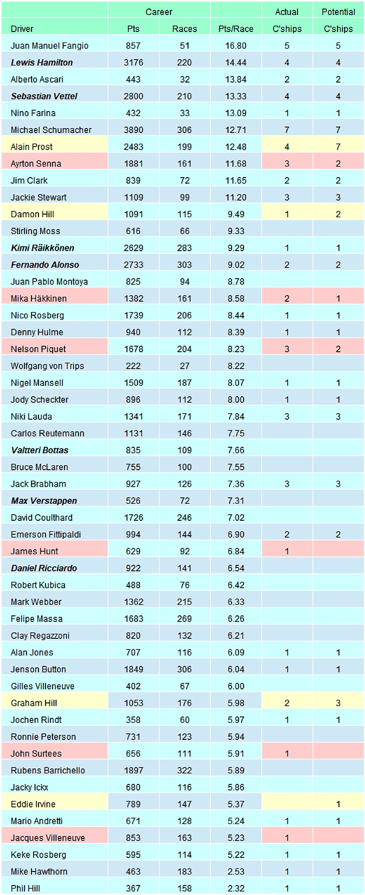 Так наибольшее количество очков за одну гонку набирал первый пятикратный чемпион в истории Хуан-Мануэль Фанхио — 16,8 балла за Гран-при. На втором месте оказался Льюис Хэмилтон с показателем в 14,44 очка. Третьим стал Альберто Аскари с 13,84 балла.