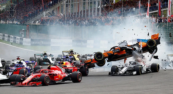 Виновником аварии послужил Нико Хюлькенберг — он слишком поздно затормозил и поддел болид испанца, спровоцировав массовый завал.