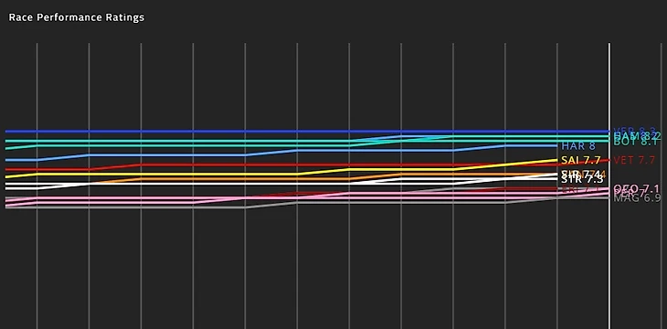 Третьим оказался гонщик «Торо Россо» Пьер Гасли – его оценка в 8,2 сложилась из 9,6 за работу с педалью газа, 5,0 за работу рулем, 9,3 за работу на торможениях, 9,8 за прохождение поворотов и 7,3 за «агрессивность». Будущий гонщик «Ред Булл» финишировал девятым.