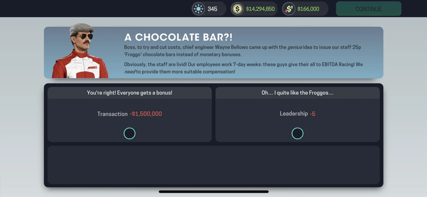 И игра предлагает заплатить персоналу деньги или оставить шоколадки и потерять в лидерстве.