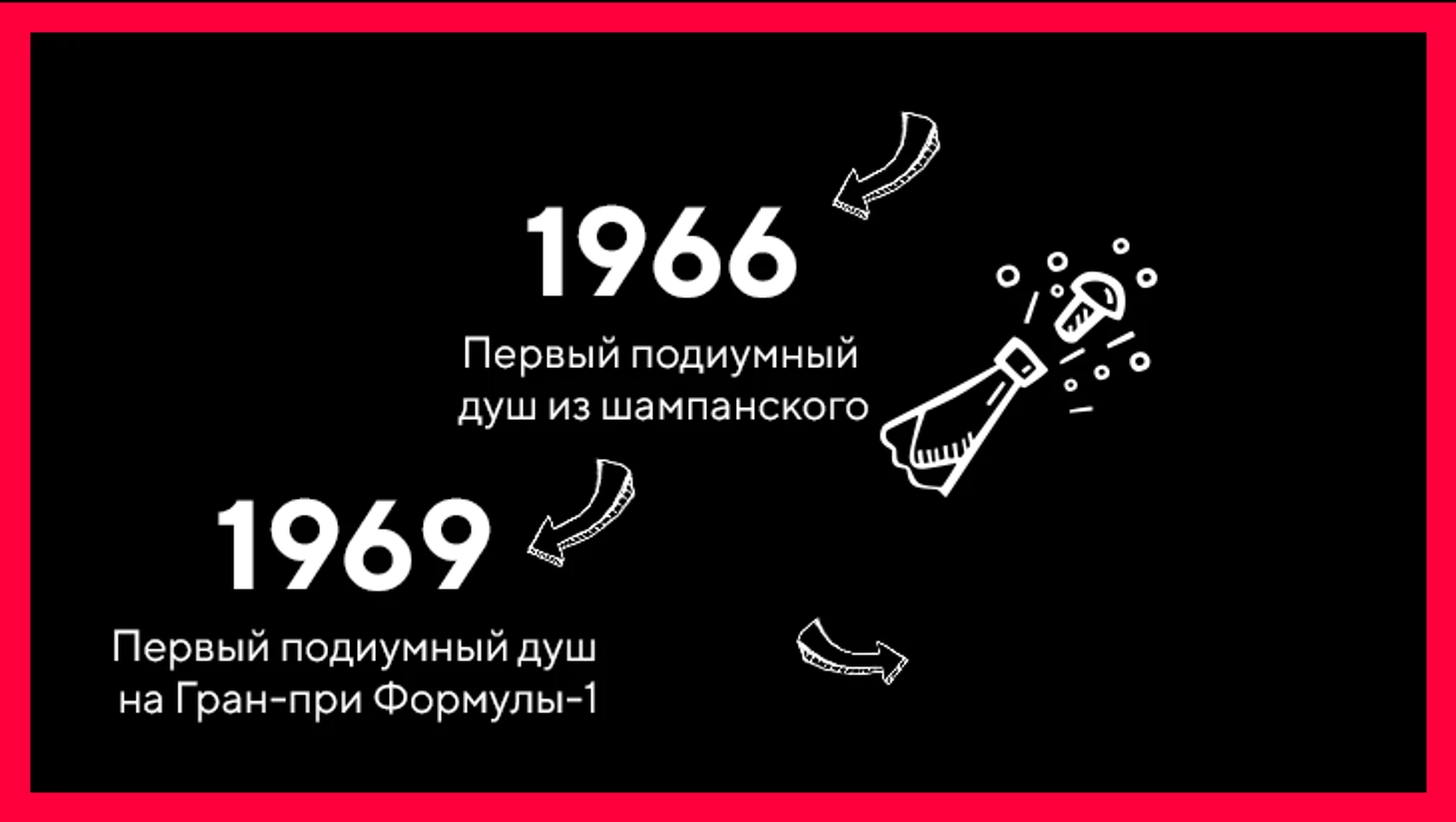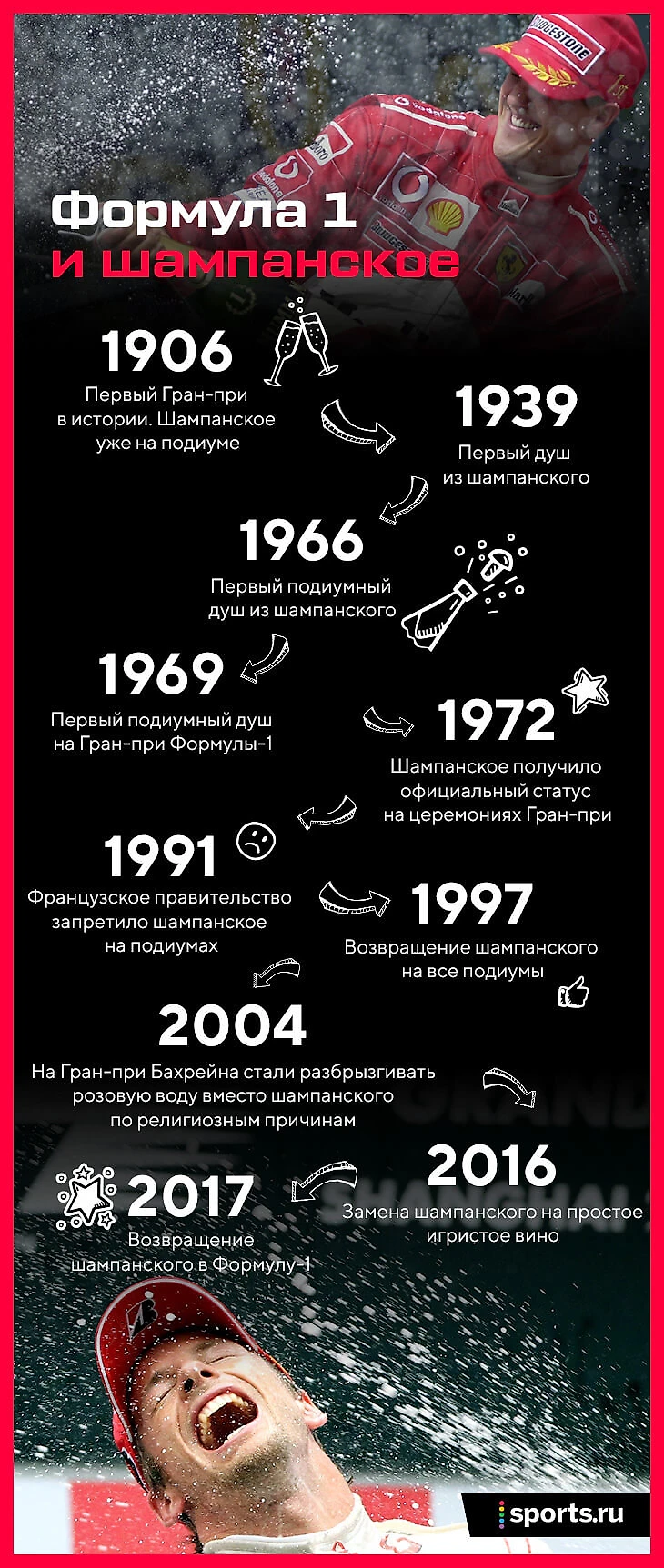 В «Ф-1» же традиция обливаться игристыми винами пришла в 1969 году, когда владельцы Moët вырвались за пределы Франции и договорились с промоутерами Гран-при Великобритании о вручении победителю их фирменных трехлитровой бутылки. Однако гонку с огромным отрывом выиграл непьющий Джеки Стюарт — и у него не оставалось выбора, кроме как вылить весь напиток на головы соперникам и зрителям.