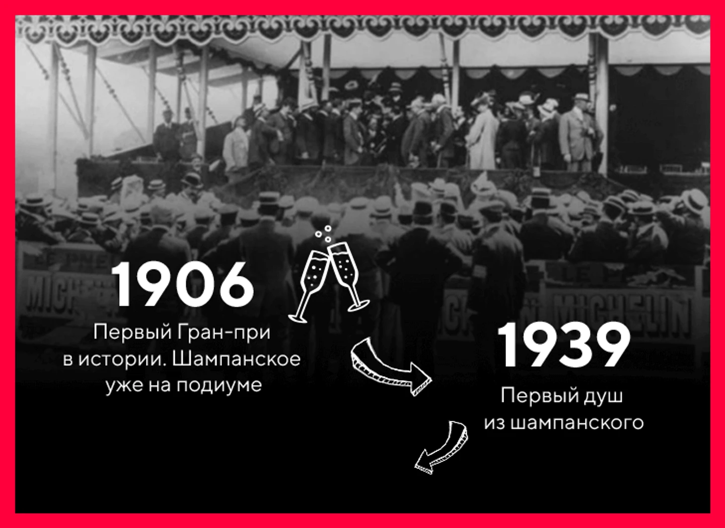 Впрочем идея с победным шампанским появилась не на пустом месте: традиция отмечать памятные автоспортивные моменты подобным образом зародилась в начале ХХ века. Еще в первом Гран-при в «Ле-Мане» в 1906 году венгр Ференц Жиж отпил шампанского из бокала в честь своего достижения. Поскольку в гонках тех лет принимали участие аристократы и обеспеченные люди, игристое вино постоянно сопровождало сопутствующие рауты и фуршеты и никак не могло минуть подиумов. Более того, наслаждение шампанским в те годы для гонщиков воспринималось как нечто обыденное, и потому многие пили напиток и перед стартом. А легендарный итальянский пилот Тацио Нуволари при наличии большого отрыва от соперников по ходу заездов нередко позволял себе бокал даже во время последнего пит-стопа.