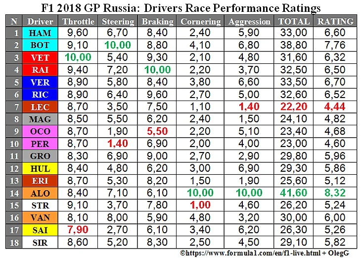 На официальном сайте «Формулы-1» в разделе лайвтайминга на странице «выступлений» появились оценки пилотам за Гран-при России, основанные на данных телеметрии. В соответствии с ними лучше всех пилотировал от старта до финиша именно гонщик «Макларена» Фернандо Алонсо — прямо как на прошлом Гран-при Сингапура.