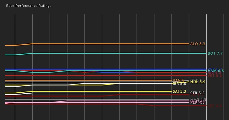 Вторым в чарте стал пилот «Мерседеса» Валттери Боттас — его оценка в 7,7 сложилась из 9,1 за работу с педалью газа, 10 за работу рулем, 8,8 за работу на торможениях, 4,1 за прохождение поворотов и 6,8 за «агрессивность». Однако блестящий пилотаж финна не помешал командному мостику потребовать пропуска к победе напарника Льюиса Хэмилтона — и Боттас покорно это сделал, оставшись на втором месте.