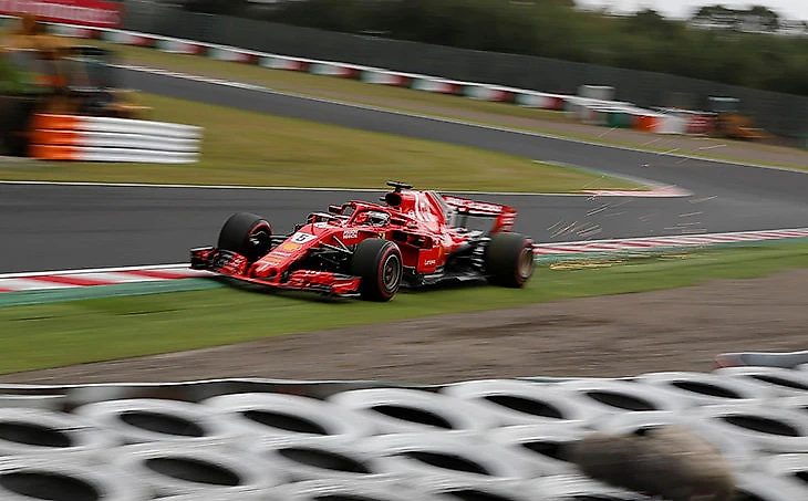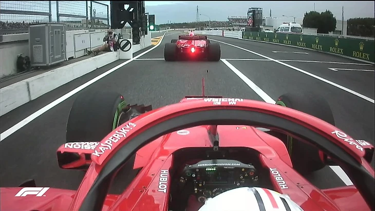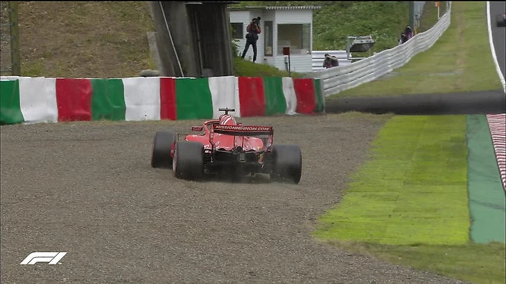 Но с обратным выездом алых болидов на трассу вернулся и дождь – «окно» для сликов быстро закрылось: шины для сухой погоды перестали предоставлять нужное для «Сузуки» сцепление и с трудом прогревались. Финскому пилоту Скудерии еще повезло: он ехал впереди напарника и зацепил чуть больше «окна» для «суперсофта», однако его машина все равно заскользила в повороте Spoon – лишь мастерство помогло спортсмену выловить технику и завершить круг. Феттель ошибся в том же самом месте на том же круге, но к тому моменту сцепления на трассе стало еще меньше — и потому гонщику пришлось выехать за пределы асфальта.