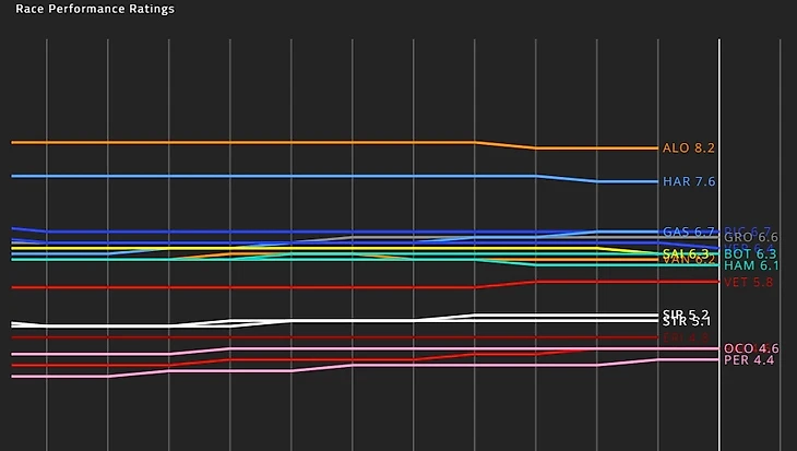 Его оценка в 8,2 сложилась из 9,2 за работу с педалью газа, 4,3 за работу рулем, 7,7 за работу на торможениях, 10,0 (максимальный балл) за прохождение поворотов и 10 за «агрессивность». Испанец уже третий Гран-при идеально преодолевает повороты по мнению автоматического оценщика «Формулы-1», но столь блестящий пилотаж не позволил испанцу втащить полумертный «Макларен» выше четырнадцатой позиции.
