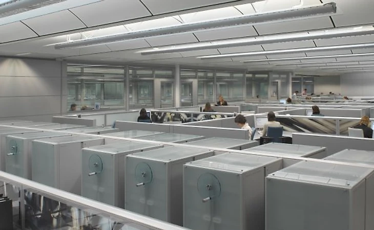 Между тем, если вы являетесь сотрудником компании, вы входили в здание, спускаясь по винтовой лестнице в подземный коридор с серым полом и белыми стенами; словно вы попадали в какой-то Оруэлловский фильм. Затем вы проходили по другой винтовой лестнице в середине здания к своему рабочему месту.